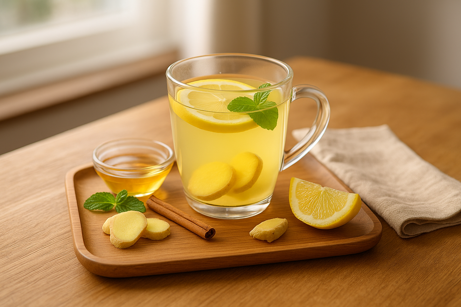 - 컵 옆에 꿀이 담긴 작은 유리볼과 생강, 레몬 한 조각을 살짝 곁들이면